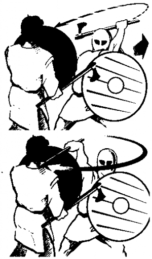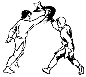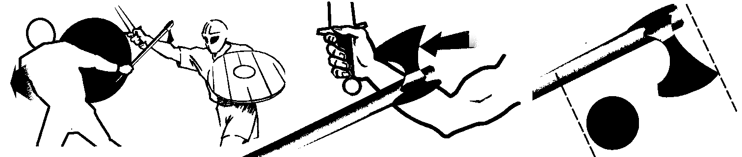 В момент зацепа следуют рывок топора на себя и одновременное движение щитом в противоположную сторону. При этом лезвие топора движется к кисти противника и «срывает» ее, ломая пястные кости и лучезапястный сустав. Выполнение зацепа руки топором сходно по типу с выполнением сдвойки. В бою без щита такой прием следует делать со смещением корпуса и головы влево или вправо и, как уже говорилось, атаковать не противника, а его атакующую конечность, то есть возможный удар. |