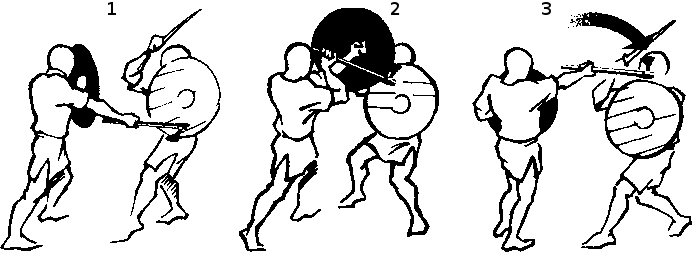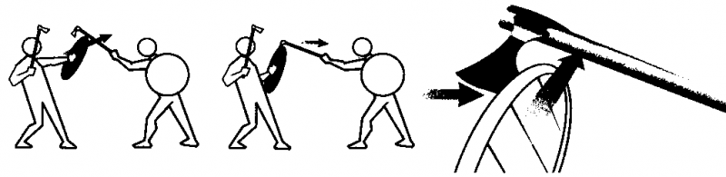В данной ситуации главное — не затягивать. В момент зацепа чужого топора за щит важно поймать момент первого рывка и резко подать щит от себя (по ходу тянущего топора). Это, во-первых, отцепит топор, во-вторых, блокирует действия боевой руки противника наложением, в-третьих, позволяет сократить дистанцию и атаковать.