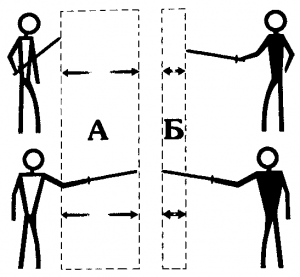 ВведениеВ былые времена по манере человека держать оружие определялась его опытность как поединщика. И в наши дни это, пожалуй, один из основных критериев определения потенциальной опасности бойца. Поднятый к голове или выставленный вперед инструмент слишком демонстративен. Рука теряет весь резерв дистанции, а противник, сам того не желая, акцентирует внимание на оружии и имеет больше шансов своевременно отреагировать на любое движение. На рисунке (лицом к зрителю) боец в характерной «подоплеке», когда клинок прибран к бедру. Визуально нелепое положение меча вводит противника в заблуждение, ибо боец кажется открытым и выглядит относительно безобидно. Главное же преимущество состоит в том, что на самом-то деле это оптимальное положение полузамаха, который позволяет почти мгновенно выполнить большинство атакующих или защитных действий, сохраняя резерв в длину руки. Схема иллюстрирует разницу активного резерва дистанции между так называемой «подоплекой» (А) и классической фехтовальной стойкой (Б). Стойка есть единое положение частей тела, в котором пребывает боец во время поединка. Как это ни покажется парадоксальным, но догматические стойки, уместные при отработке базы, в бою чаще всего бесперспективны! |