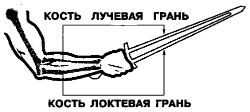 ВведениеСамые жестокие и опасные приемы, как правило, примитивны и просты. Страшными их делает то, что они легки в освоении и по технике исполнения не требуют особого физического развития. В данном руководстве приведены описания приемов для правшей. Это обратные удары лучевой гранью клинка. Лучевая грань находится со стороны лучевой кости, соответственно, локтевая грань — со стороны локтевой кости (см. рисунок справа). |