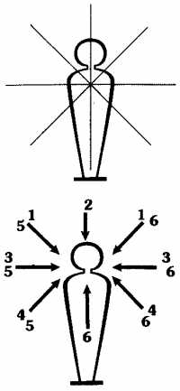 Таким образом, мы имеем восемь направлений, по которым строятся практически все удары. Атаки по ногам и по корпусу, в сущности, являются теми же векторами, только со смещенными вниз координатными осями. Однако в рамках концепции Зареченской школы мне представилось более целесообразным отталкиваться не от восьми направлений, а от четырех секторов, в которые укладываются и восемь основных векторов, и все многочисленные промежуточные направления и варианты ударов. |