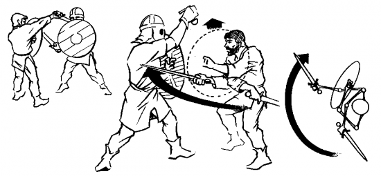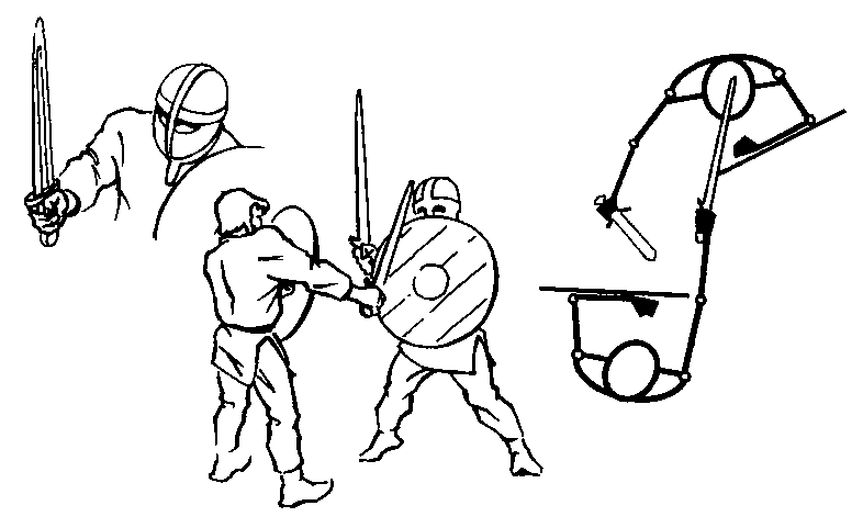 Прямые и ломаные ударыПо сложности выполнения почти все удары можно разделить на две основные группы. Прямые - при выполнении которых плечевой сустав, кисть и клинок почти не выходят из плоскости удара. Характерными примерами таких ударов могут быть засечные, спуск, раскол. Ломаные - при выполнении которых плечо, кисть и клинок двигаются в разных плоскостях. Такими ударами являются захлест, плевок, накрут, обратки. Ломаным ударом можно поразить противника в обход защиты или при активном перемещении. На рисунке показано основное различие таких действий: при одном и том же положении противника прямой засечный приходится в щит, в то время как ломаный удар «обратка» достигает цели. |