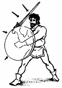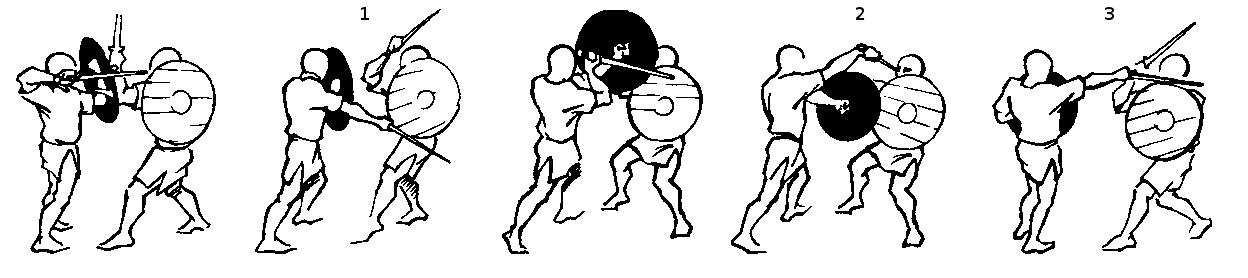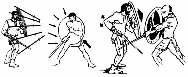 Тоже строится по принципу блокирования сектора возможных атак. Из подоплеки проводится резкий перенос щита в защиту верхнего уровня, а меч просто опускается параллельно бедру. Щит располагаем ближе к атакующей руке противника. |