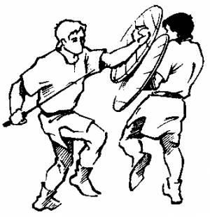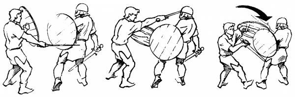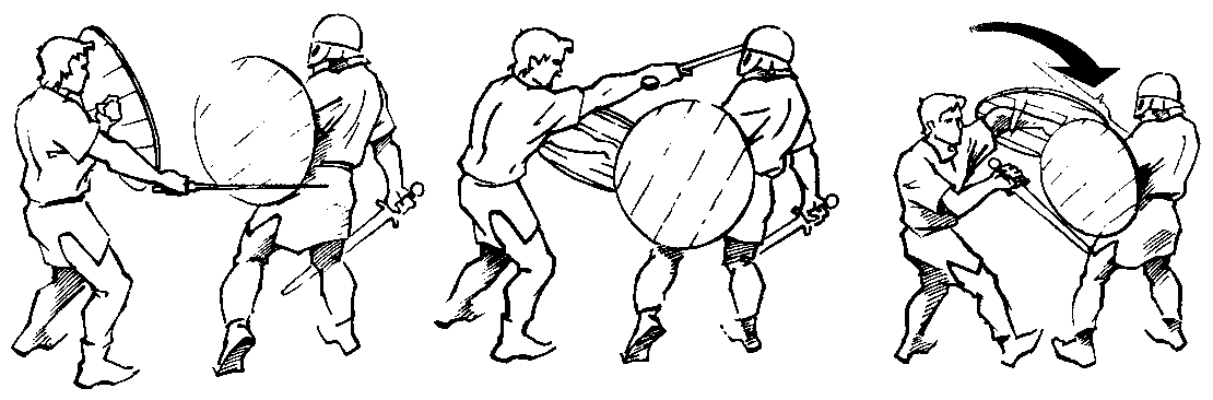 Действие щитом или навершием с целью сместить щит противника с положения защиты и атаковать открывшуюся область. «Зацеп» щитом за край щита. При этом щит противника либо отводится (отгибается) наружу, либо сдвигается с траектории предстоящею атакующею удара. Некоторые бойцы делают «зацеп» с места, предварительно приблизившись на нужную дистанцию и резко выбросив руку со щитом. Такой вариант особенно удобен при большом росте и использовании щита с кулачным хватом. Менее рослые бойцы предпочитают готовить зацеп предварительным действием или комбинацией. Смысл комбинации в том, чтобы своими действиями «оттопырить» щит противника в удобное положение (вывести его край на некоторое отдаление от корпуса). Чаще всего наносится удар в нижнюю часть щита или бедро. В тот момент, когда щит противника слегка кренится или опускается к бедру, производят зацеп оттопыренного края, смещение щита и удар по открывшемуся участку. |