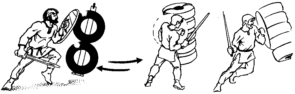 Определите минимальное (необходимое и достаточное) движение щита для защиты головы и бедра. Как правило, оно гораздо меньше, чем делают большинство бойцов. В пылу боя щит выдвигается слишком сильно вперед и вверх. Это обусловлено природным рефлексом защиты головы открытым предплечьем, выработанным в рукопашных боях. Щит же прибавляет к руке 30—50 см защитного поля. В момент защиты головы чаще всего достаточно движения предплечьем, при неподвижном локте, зафиксированном у корпуса (локоть должен находиться напротив нижних подвижных ребер — «микиток»).