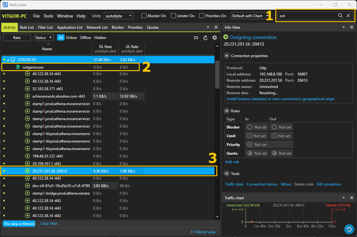 Непосредственно во время рейда запустите NetLimiter и введитеsotв строку поиска так как показано на скриншоте. - [2] на скриншоте: