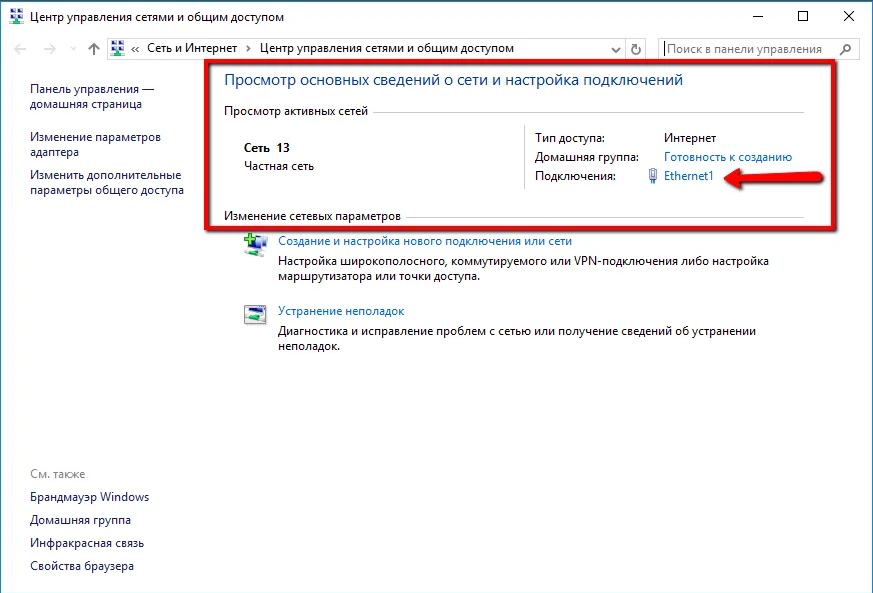 В разделе Просмотр основных сведений о сети и настройка подключений, выберите пункт Ethernet для Подключения.