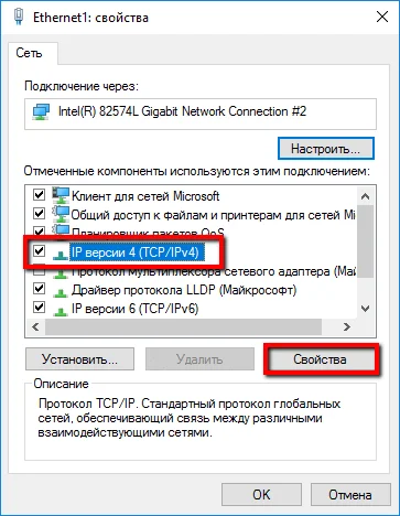 В окне свойств подключения в списке Отмеченные компоненты используются этим подключением выберите пункт IP версии 4 (TCP/IPv4) в Windows 10 или Протокол Интернета версии 4 (TCP/IP) и нажмите кнопку Свойства.