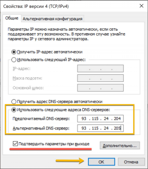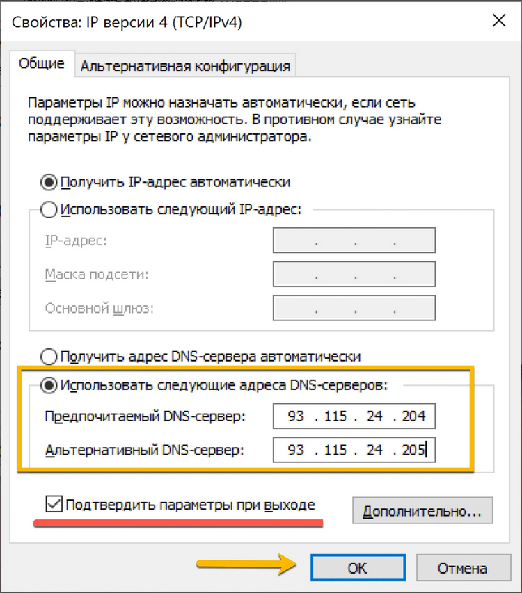 В открывшемся окне на вкладке Общие выберите пункт Использовать следующие адреса DNS-серверов и введите IP-адреса, указанные ниже: