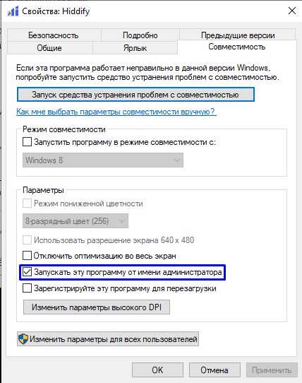 После скачивания и установки Hiddify, измените настройки запуска ПО в окне свойств, как показано ниже (внешний вид окна может отличаться в зависимости от ОС):