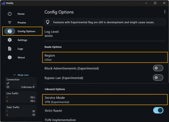 Запустите Hidify и скорректируйте конфигурацию в разделе «Параметры конфигурации» (Config Options) как показано на скриншоте ниже: