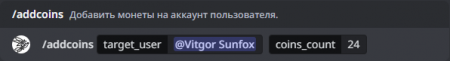 Команда добавляет указанное количество монет выбранному пользователю. Изменения применяются сразу по выполнении команды. В канал уведомлений будет отправлено соответствующее сообщение, с упоминанием выбранного пользователя.