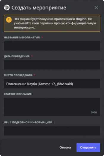 После того как команда будет вызвана, откроется форма «Создать мероприятие». В ней необходимо указать название мероприятия, дату и место проведения. По желанию можно добавить описание мероприятия и ссылку на страницу с подробной информацией.