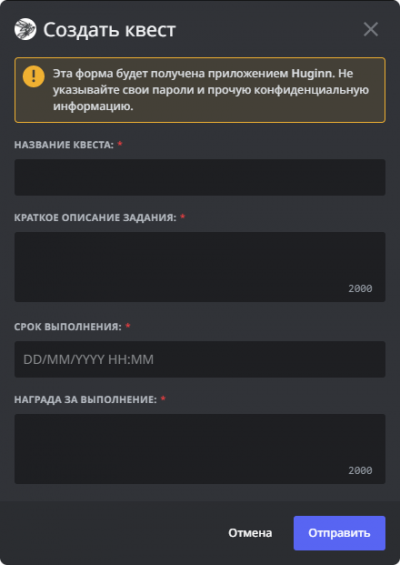 В результате вызова команды откроется форма «Создать квест». В ней необходимо указать название квеста, описать суть задания, указать дату - срок исполнения, а также предложить награду для тех кто справится с заданием.