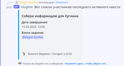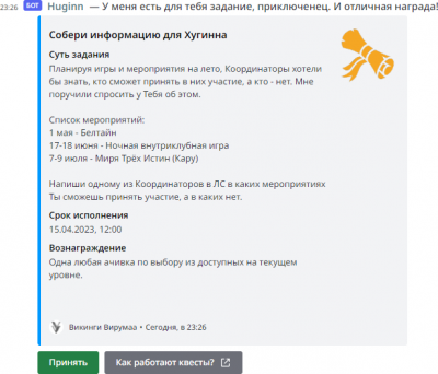 После отправки формы, в канал уведомлений придет сообщение с информацией о квесте. Под сообщением будут размещена кнопка «Принять» - для регистрации на участие в квесте.