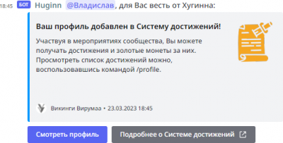 Профили Системы достижений хранятся в отдельной базе данных, таким образом пользователей Discord-сервера, желающих получать достижения, необходимо регистрировать отдельно, при помощи бота. Пользователь получит уведомление о создании профиля в канале уведомлений.
