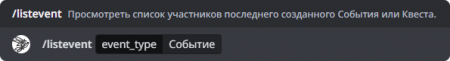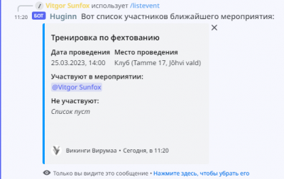 Команда показывает список зарегистрированных участников, а также отказавшихся от участия в Мероприятии, для которого в данный момент открыта регистрация, либо для последнего мероприятия, созданного при помощи Бота (в том случае, если дата мероприятия уже прошла). Результат вывода команды будет показан пользователю, вызвавшему её. Команда доступна только для пользователей с ролью модератора или администратора.