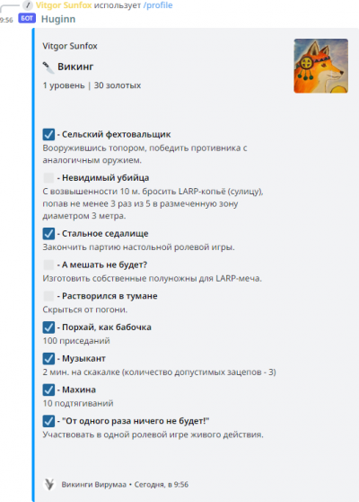 Бот позволяет создать некоторый список достижений (свершений), которые смогут получать пользователи сервера, и разделить такие достижения на несколько уровней. При выполнении достижений на имеющемся уровне участник системы автоматически получит следующий уровень, и новые достижения, которые необходимо выполнить на новом уровне. Предполагается, что уровень сложности достижений растет с каждым уровнем, однако достижения могут быть шуточными или такими, которые мотивируют пользователей Системы участвовать в деятельности Вашего сообщества в течение длительного периода времени. |