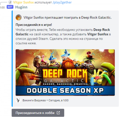 Команда проверяет наличие профиля Bifröst Connect в базе данных, связанной с Discord-сервером. Если профиль существует, и для него указан идентификатор Steam, бот попытается получить информацию о текущей активности пользователя в Steam. Если в данный момент у пользователя запущено приложение из библиотеки Steam, бот попытается получить информацию об этом приложении и сгенерировать ссылку для перехода на сервис Bifröst Connect. В результате выполнения команды, появится сообщение с приглашением пользователей в игровое лобби. Под сообщением будет размещена ссылка на страницу bifrost.snfx.ee, где пользователь сможет нажать кнопку подключения к игровому лобби, и отправить создателю приглашения заявку в список друзей Steam. |