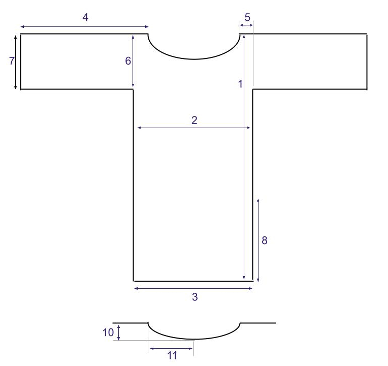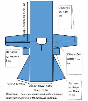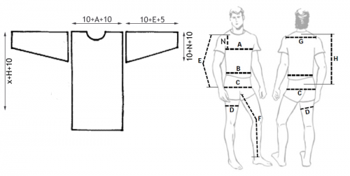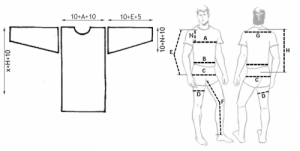 Эта выкройка является цельной - это значит что две стороны рубахи вырезаются из цельного куска ткани вместе с рукавами и затем сшиваются друг с другом.